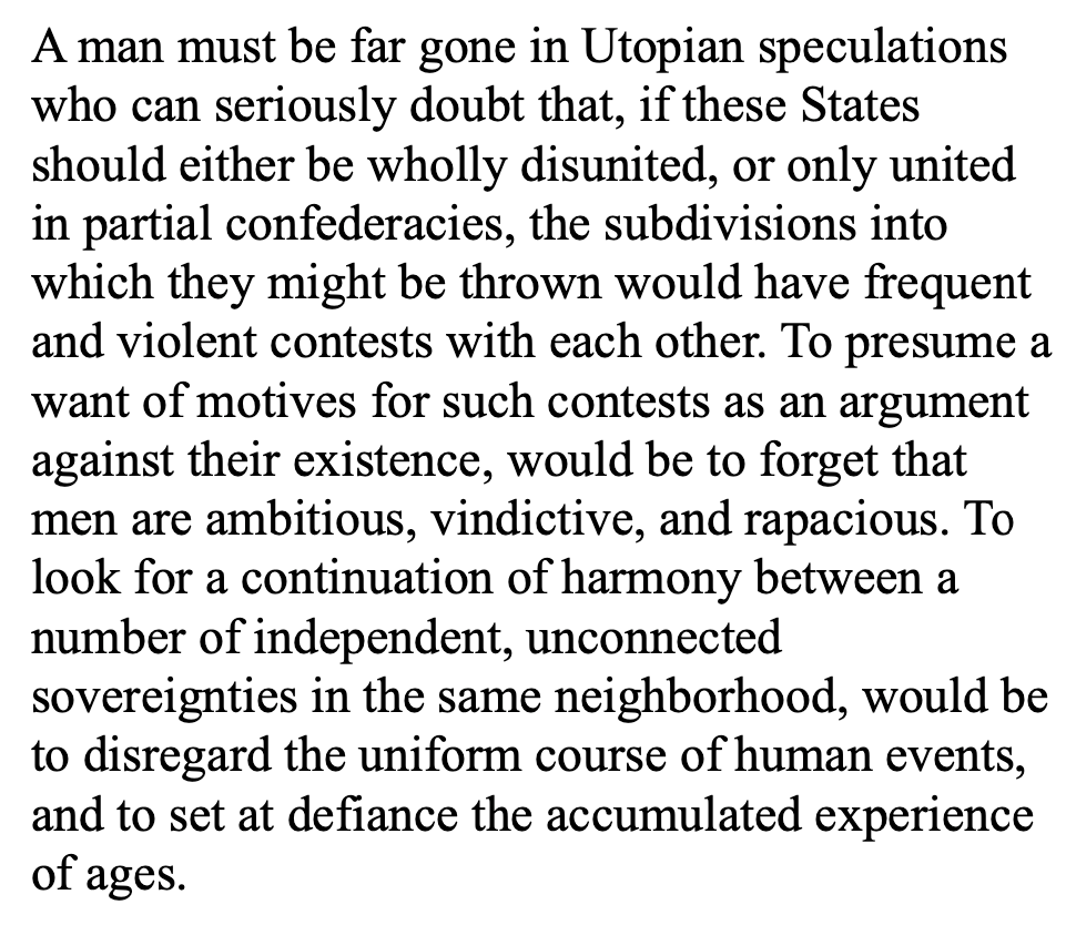 为便于学生能够通过译文理解本段英文的句法, 我这里尽量采取直译的方式: 如果有人真的会怀疑以下这一点, 那他就陷入了乌托邦式的幻想 (言下之意: 以下这一点毋庸置疑): 如果美国各州处于四分五裂的状态, 或只是以部分联邦制的形式结合在一起,那么这些细分单元(各个州/各个部分联邦)之间必将陷入频繁的,剧烈的争吵/斗争。如果有人会天真地以为这些州/部分联邦之间没有动机去斗争, 并以此为由说这种斗争不会存在, 那他们就是忘了人性是有野心的, 报复的和贪婪的。如果有人指望说处于同一个社邻之中的各个独立自主的州能持续的和谐共处, 那就是在无视人类历史的进程, 在违抗世世代代的经历积累下来的经验之谈。