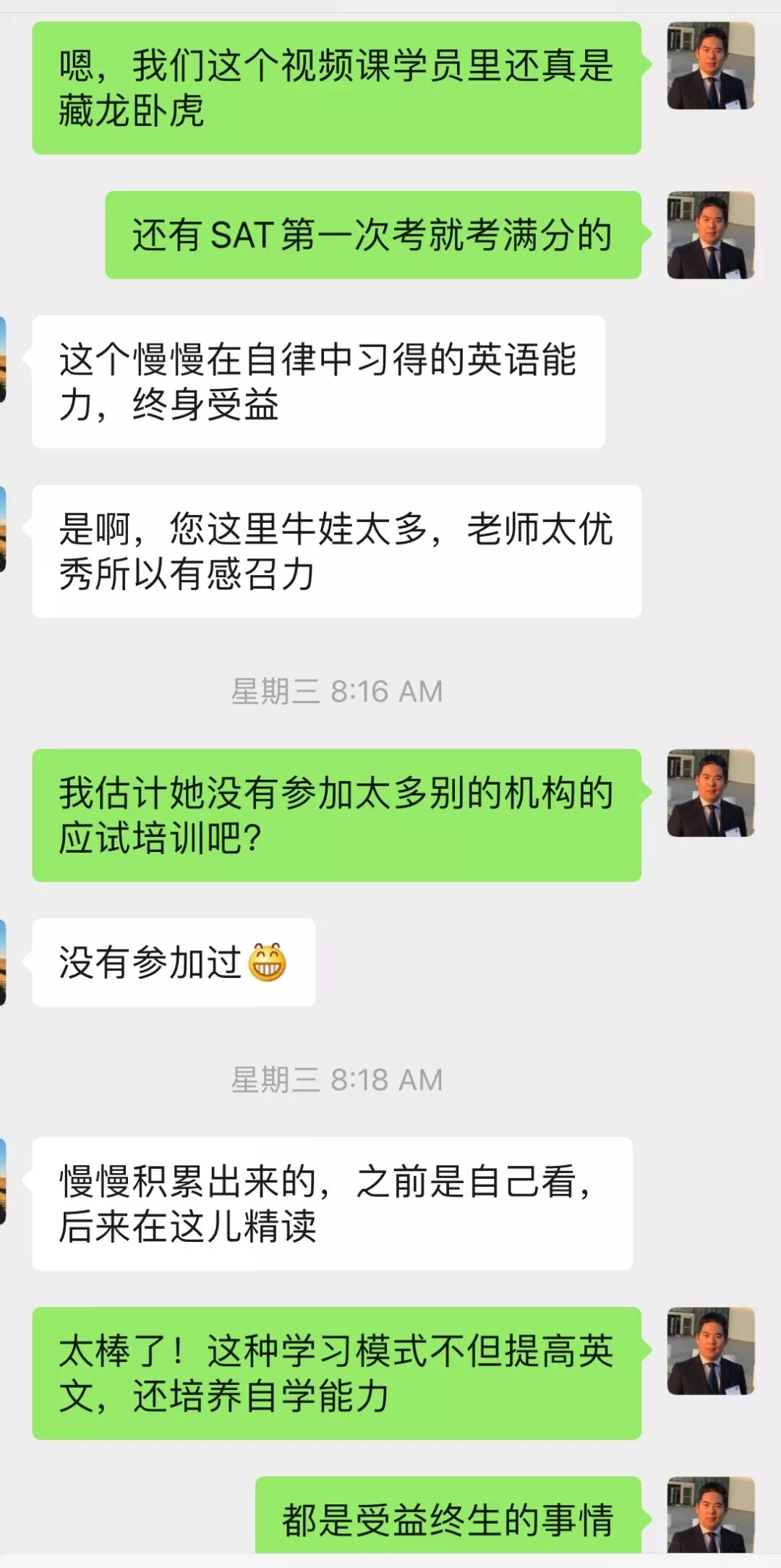前两天,善恩视频课程的忠实学员J给我发来好消息:她女儿录取了牛津大学!于是我们就进行了一番愉快的交流。J同学孩子的英语基本靠自己阅读和学习善恩的视频课程,轻松摘取雅思裸考8.0的成绩和牛津offer。结合昨天我们公众号刊发的FZZ同学的SAT满分经历,以及更早些时候(2018年8月)Tommie同学SAT满分...,规律是非常明显的:这些学生们都具有非常好的自主学习能力。这不由让我想起了前几天我和一个清华校友的一番交谈。清华校友在波士顿某IT公司担任高管,他11年级的孩子也是学霸:10几门AP全都是5,计算机编程能力出众,已经熟练掌握Python和C语言,对数据结构和算法也有不少的研究。我问他是不是请了老师辅导或者自己亲自上阵。他告诉我居然都是孩子一个人自学的!而这一切,都是他刻意培养出来的。他告诉我说:他在培养孩子的时候遵循一个原则 — 能够让孩子通过自学获得的知识和技能,就鼓励他通过自学获得。细细想来,这句话里智慧不少。我们常说要“授人以渔”,而学生的“渔”就是自主学习能力。据我的观察,美国的基础教育虽然整体要求不高,但学生们的自学能力普遍要比中国学生更强。许多孩子常常通过YouTube、Coursera、Khan Academy这些在线教程学习新知识。我们家老大的历史知识基本上就这么来的。并且,因为基础学业要求并不高,学校环境也比较宽松,很多学有余力的孩子可以投入大量的时间做他们感兴趣的事情,钻研他们感兴趣的知识。诸如14岁就在自己车库里造出核聚变反应堆的怪才也就这么诞生了。而美国教育体制下学生的“长期潜力”也是这么来的 — 他们可能现在没有中国学生学得多,但他们一旦找到了方向和热情,持续发力的能力是可怕的。清华学霸告诉我,他孩子学习的那些计算机知识,其实他都能教。但他除了给予少量的启蒙和答疑,他都故意忍住不教,为的就是培养孩子的自我学习的能力。结果,孩子自己去网上搜索视频教程自学,并且有空就学就看,进步神速。回头来看,虽然开头慢了点也费事一点,但长期来看的确是非常明智的做法。上海这位牛津学霸的妈妈也是这样:她没有给孩子报任何英语培训班,而只是给她买了很多英语原版书,配合以善恩的在线视频课程,结果...大家也都知道了:收获了扎实英文能力的同时,也培养了自学的能力和自信。相信这些能力会伴随她一生。善恩的视频课程就是出于这样的初衷而设计:我们希望给中国学生创造一个自主学习的平台,一个过滤浮躁和功利并以提高学生真实英语能力为目标的学习平台,一个能为用户带来极大便利、节省可观培训费用的平台,一个帮助中国家庭培养孩子自主学习能力的平台。