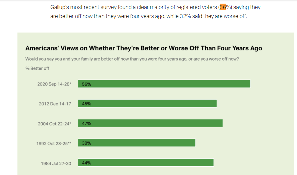 美国民调机构盖勒普在今年10月初作的一项民意调查结果显示,56%的美国人认为即使身处疫情之中,现在也比4年前过得好。而且在这个指标上,川普比他前任们都强。这个数据是衡量总统业绩的最重要的一项指标。这背后意味着更多的就业机会,更高的收入,更乐观的前景…显然,美国人对川普执政这几年的经济成就是认可的。